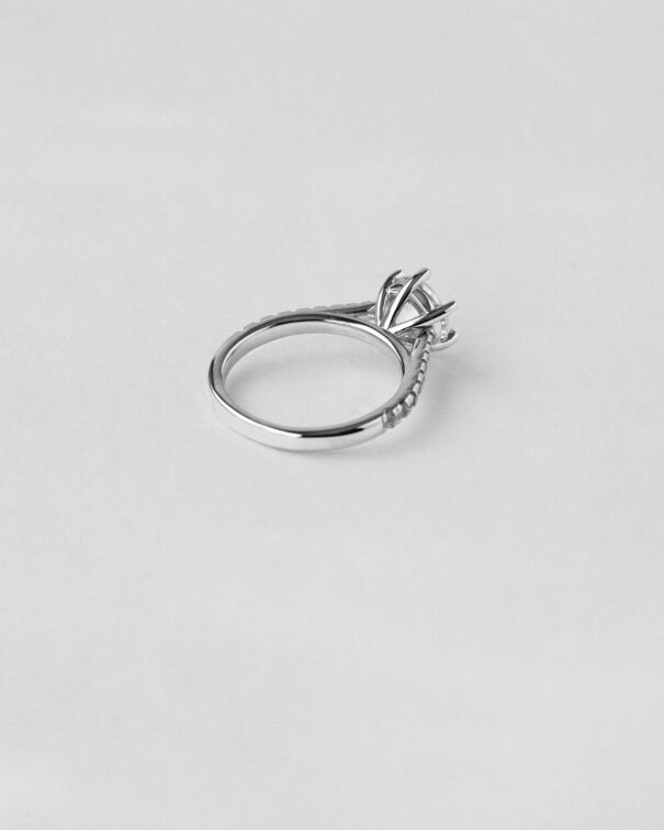 Lovelei’s Tapered Pavé Round Cut Engagement Ring is meticulously handcrafted in 18k gold and features a round brilliant cut ethical lab-grown center diamond and pavé diamonds held in a tapered four-prong setting. The center diamond is held in a six-prong cathedral setting which is made to sit low on the finger and flush with a wedding band. Pair with a diamond band from our collection to complete your wedding set.